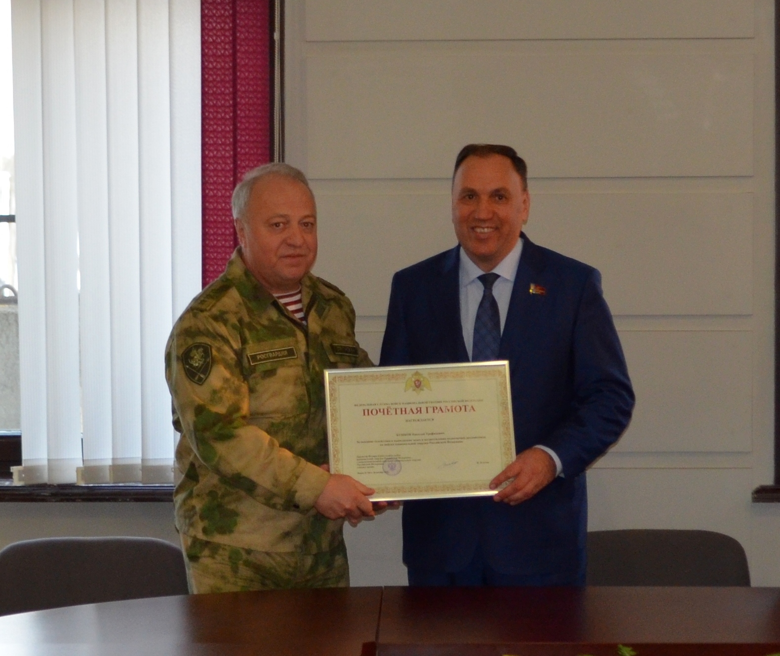 Почетную грамоту Федеральной службы войск национальной гвардии Российской Федерации за оказание содействия в выполнении задач и осуществления полномочий, возложенных на войска национальной гвардии Российской Федерации Н.Т. Бушкову вручил Командующий Сибирским округом войск национальной гвардии Российской Федерации генерал-полковник Виктор Николаевич Стригунов.