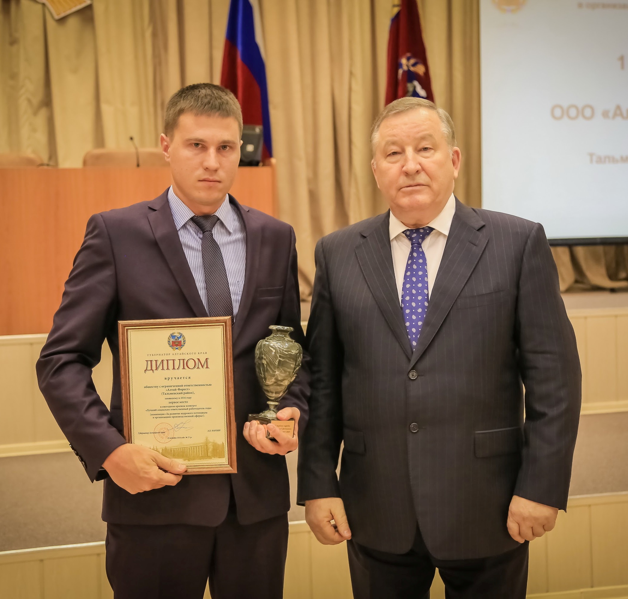 29 ноября в Алтайском крае состоялась торжественная церемония награждения победителей и призеров краевого конкурса «Лучший социально ответственный работодатель года». Алтай-Форест в очередной раз занял первое место в номинации «За развитие кадрового потенциала в организациях производственной сферы». На торжественном награждении наше предприятие представлял исполнительный директор Бушков Евгений Николаевич.